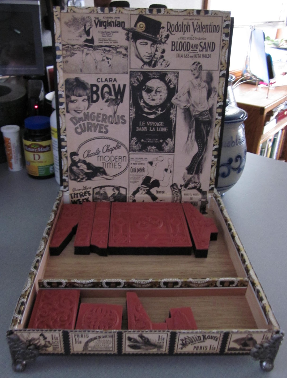 I finished this cigar box using the new Graphic 45 Curtain Call paperline. I left the bottom natural as I am going to store stamps in the box.